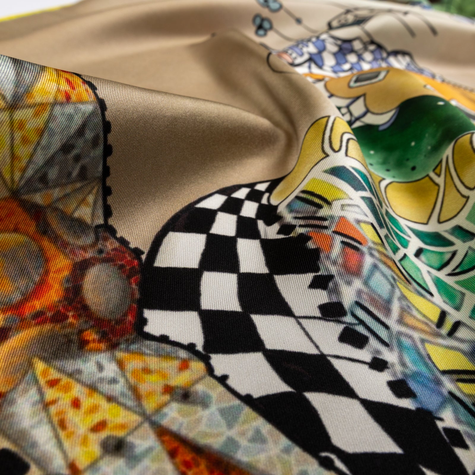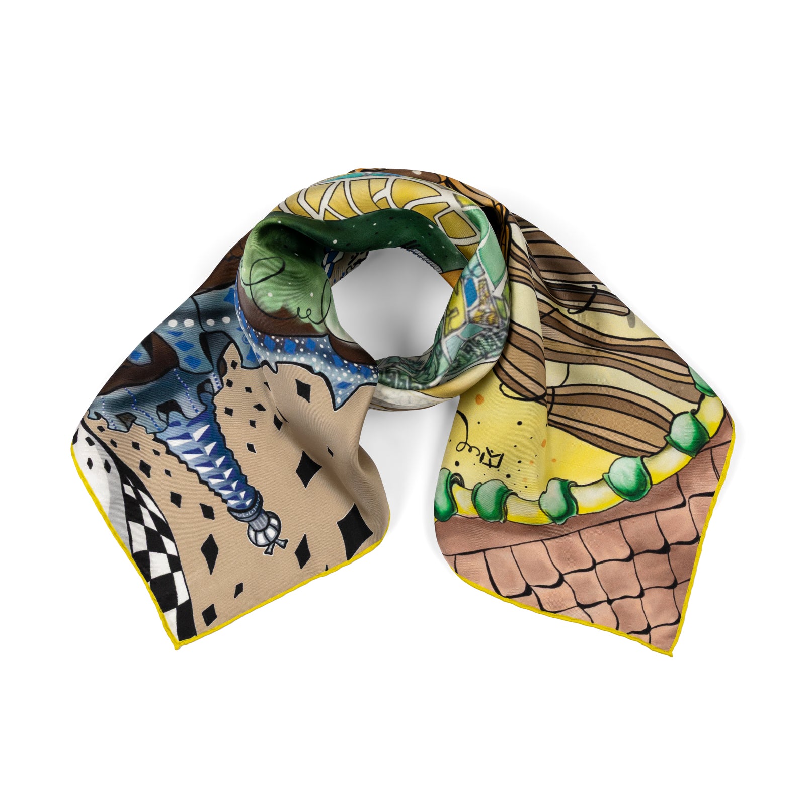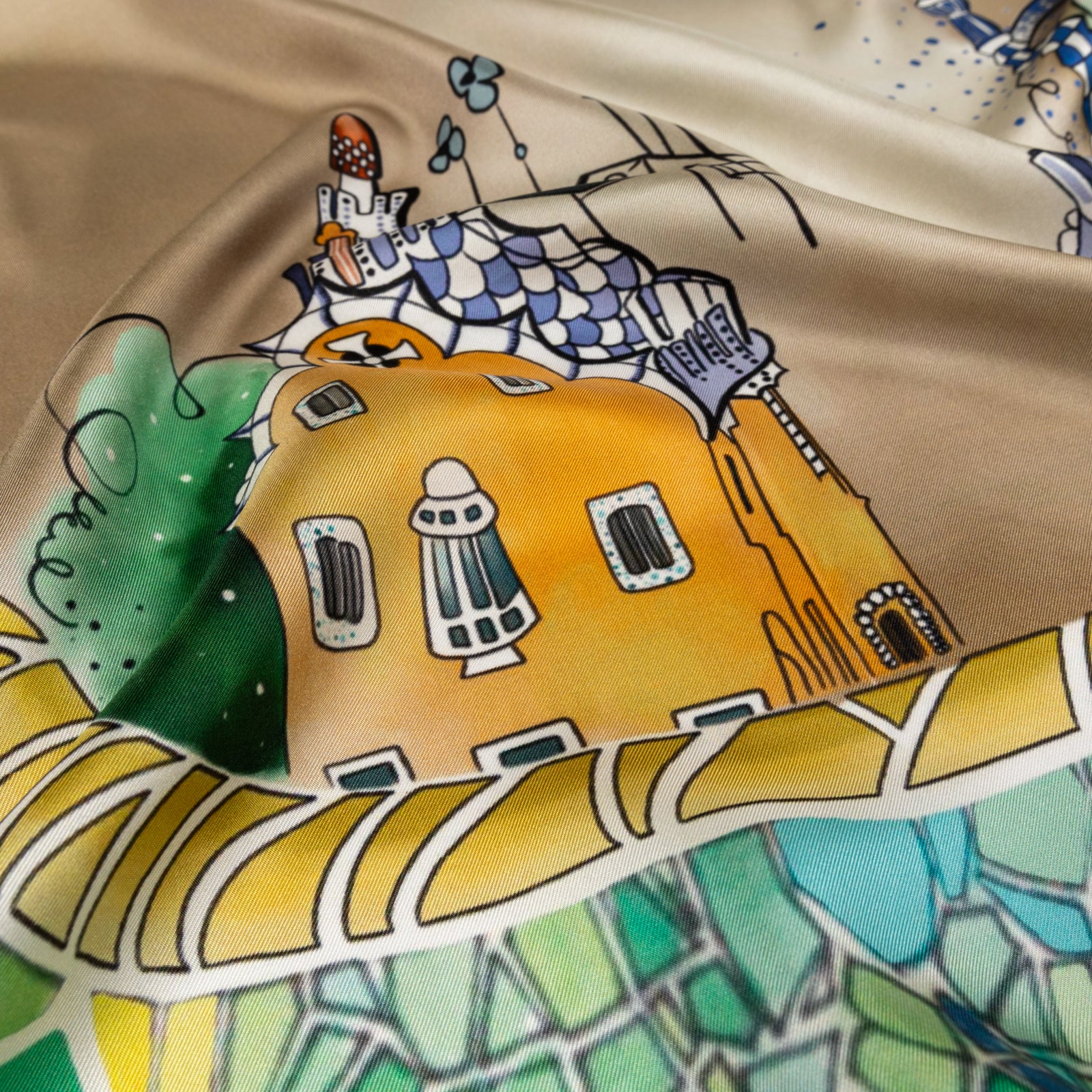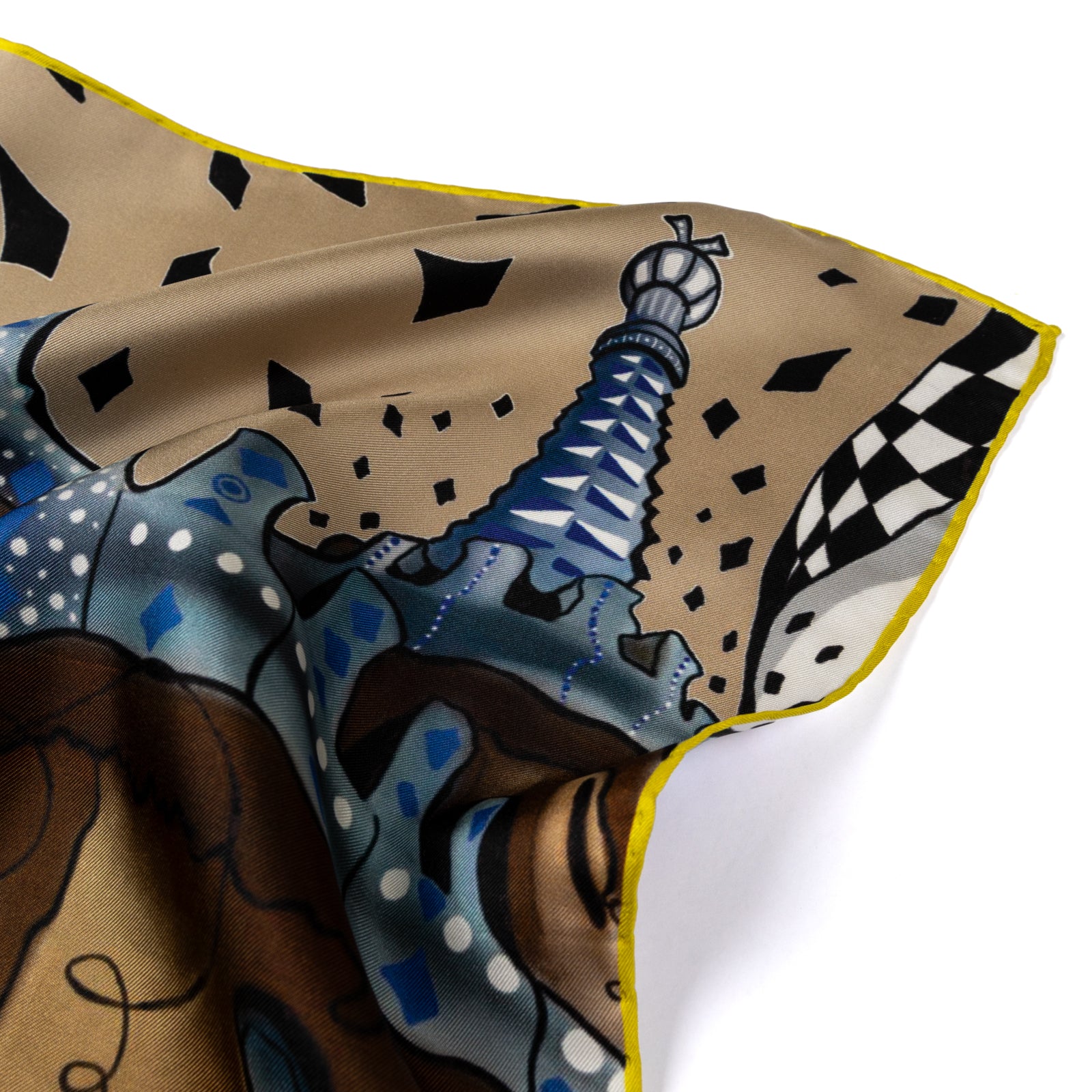 Fularımızın her bir detayı, Gaudi'nin eserlerindeki mozaiklerin, sütunların ve kıvrımların zarafetini yansıtıyor. Renklerin canlılığı, İspanya'nın enerjisini ve neşesini simgeliyor. İpeğin yumuşak dokusu, Gaudi'nin eserlerindeki inceliği ve zarafeti vurguluyor.